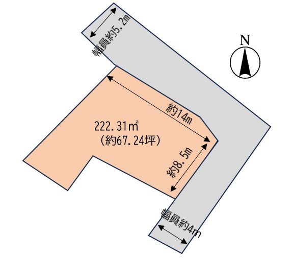 - 北側:公道、幅員約5.2mに間口約14m接道、東側:公道、幅員約4mに間口約8.5mに接道