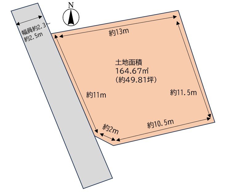 - 西側:公道、幅員約2.3~2.5mに間口約11m接道